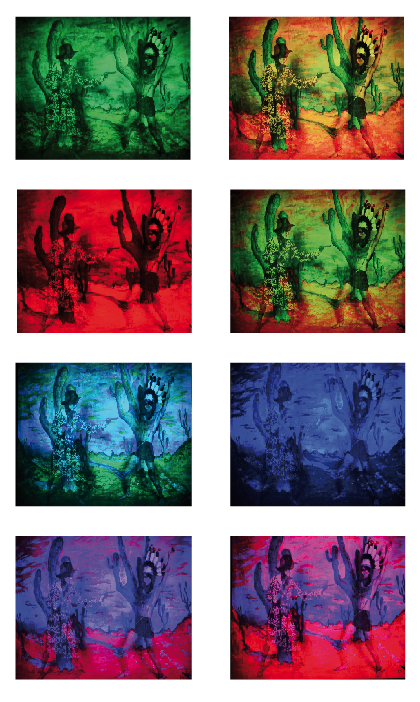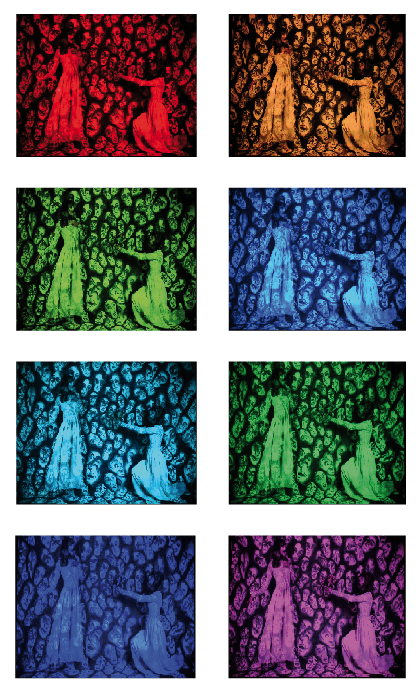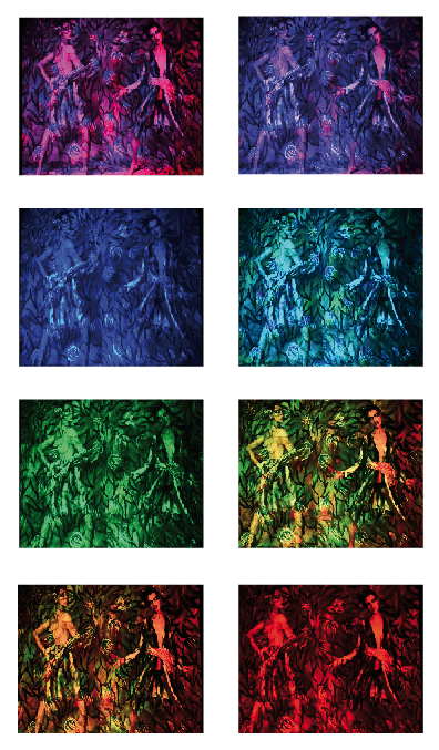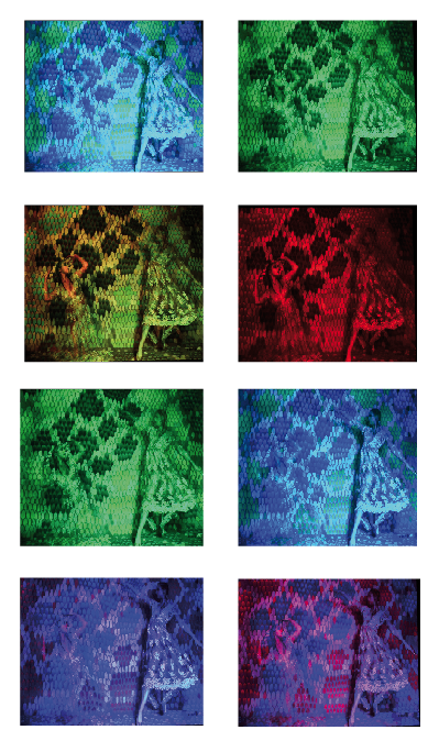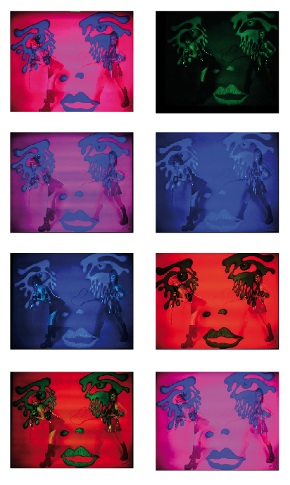 The 12 works were created by CecilBoyd using an original combination of processes and media. Painted backdrops establish an aesthetic mood, over which their dreamlike subjects are photographically layered. The images are then framed as interactive light installations. Using a dedicated controller, the viewer can select different layers of colour individually or leave them to continuously flow through the spectrum from one to the next.