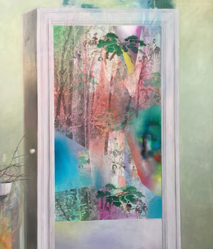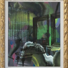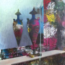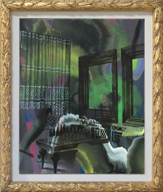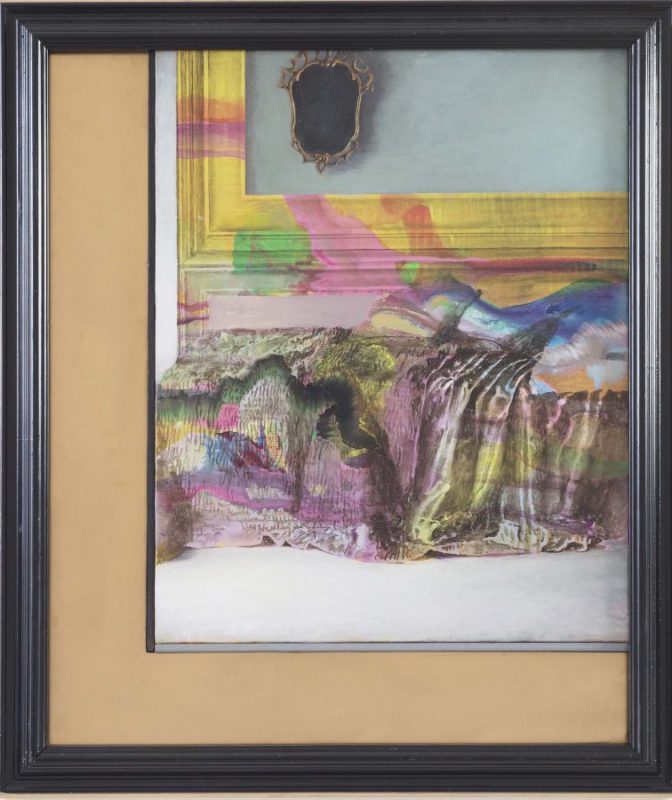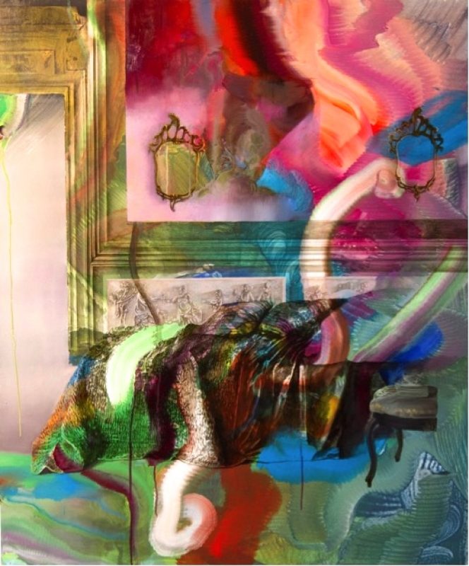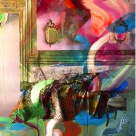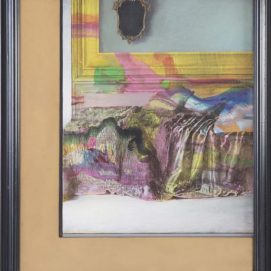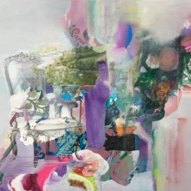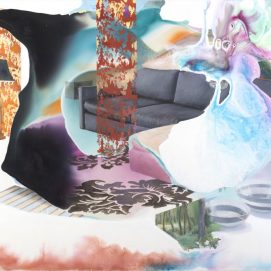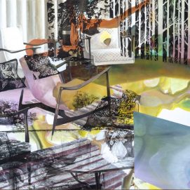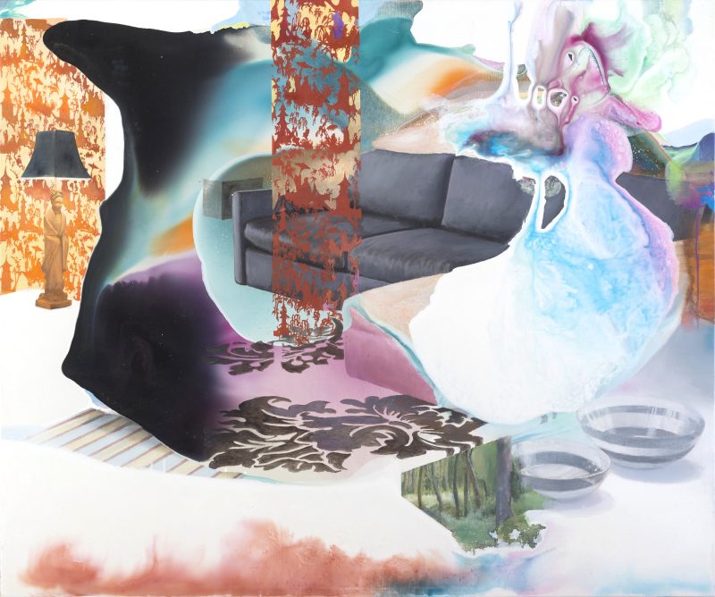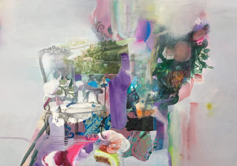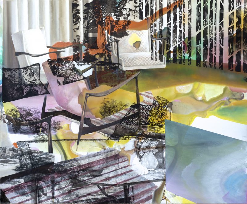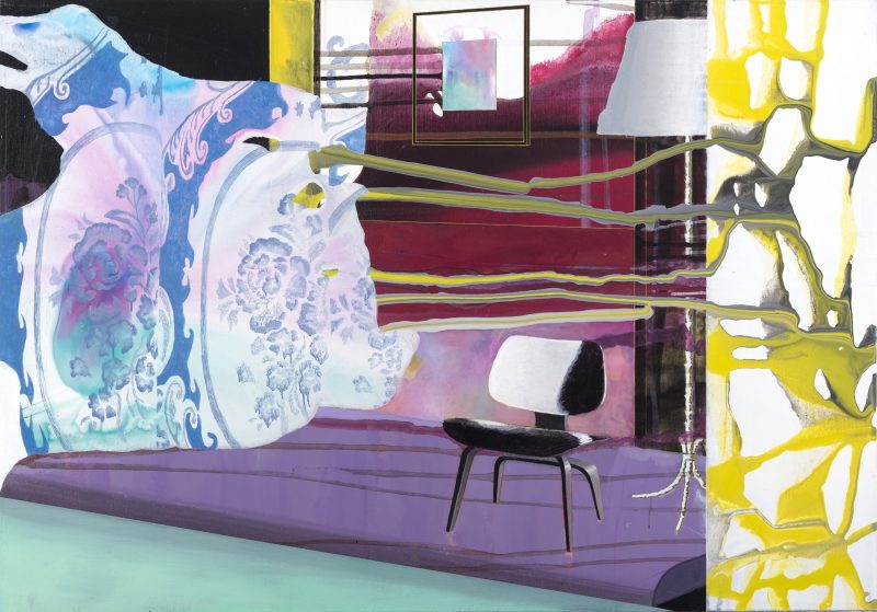 After selecting the images, often taken from interior design magazines, Pontrelli began work on his canvas, preparing the surface and choosing the right colours to give life to his work. The human elements emerge from the figures of armchairs, chairs and tables placed on the canvas, being transformed into icons, in still lifes.