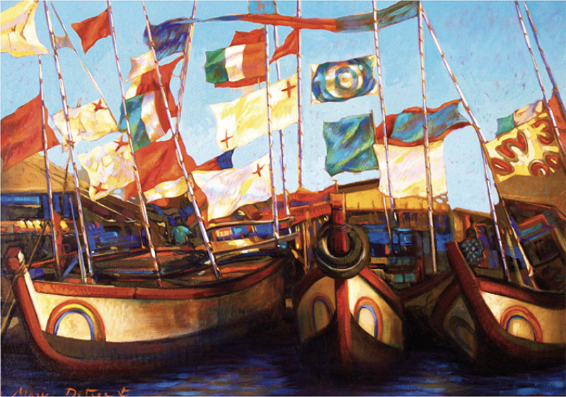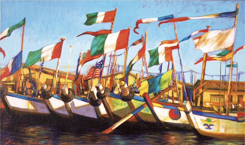 Official Painters of the French Navy receive no remuneration from the Ministry of Defence. Their sole obligation is to participate every two years in the “Salon de la Marine” which is held at the Musée de la Marine in Paris. The only privilege granted to them is to be able to add an anchor to their works by their signature.